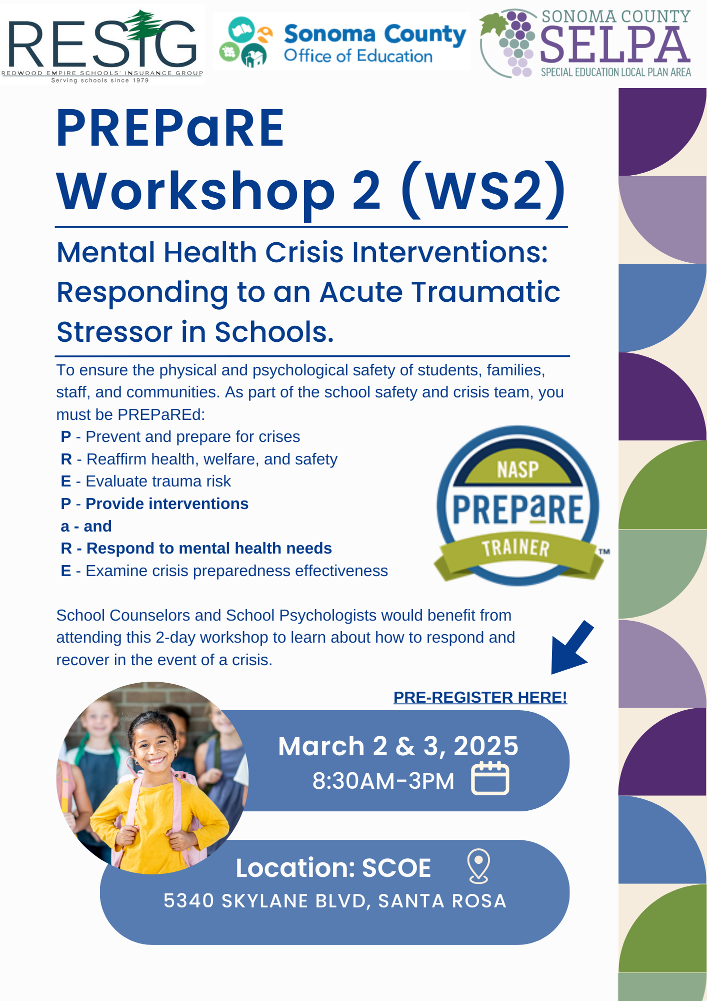 PREPaRE Workshop 2 is appropriate for any individual filling the role of crisis intervention specialist. This includes school mental health staff (school psychologists, social workers, counselors, and nurses), administrators, and other individuals whom the team has identified as appropriate providers of psychological first aid. Additionally, this workshop can be very helpful for community-based mental health practitioners who may work with the school crisis team and/or may be brought into the school to assist in response to a crisis.
